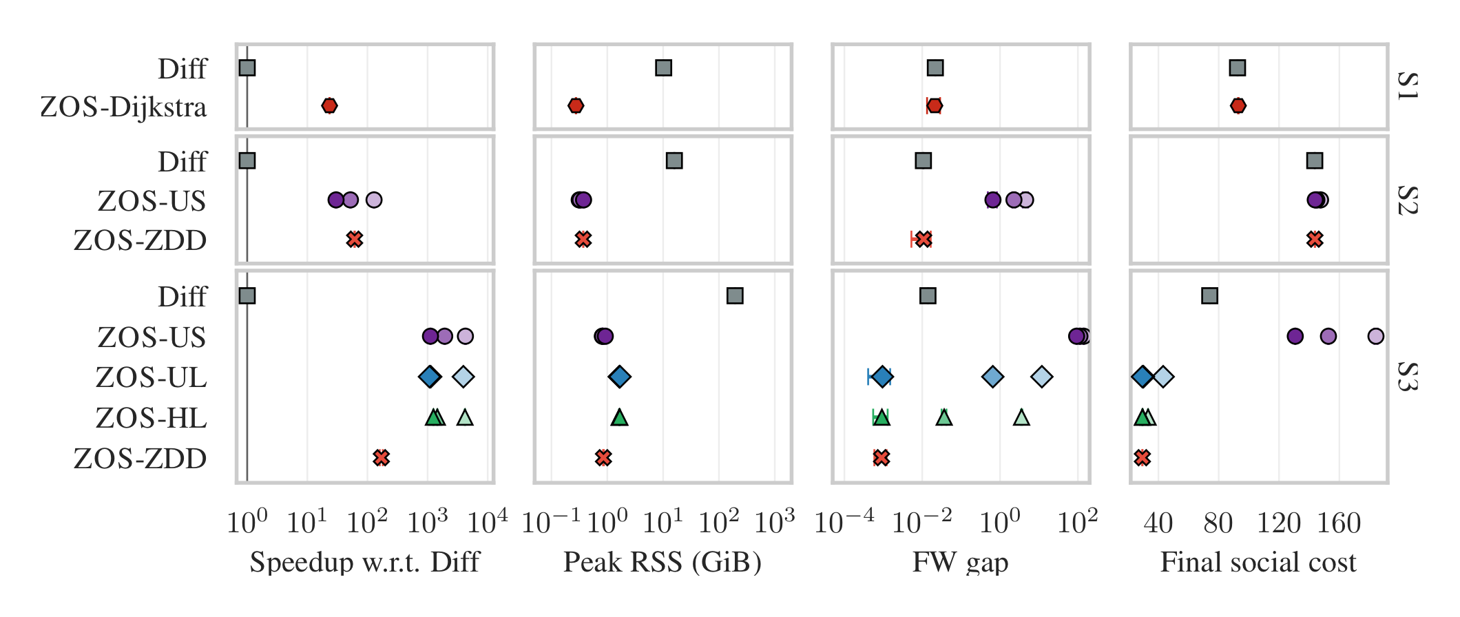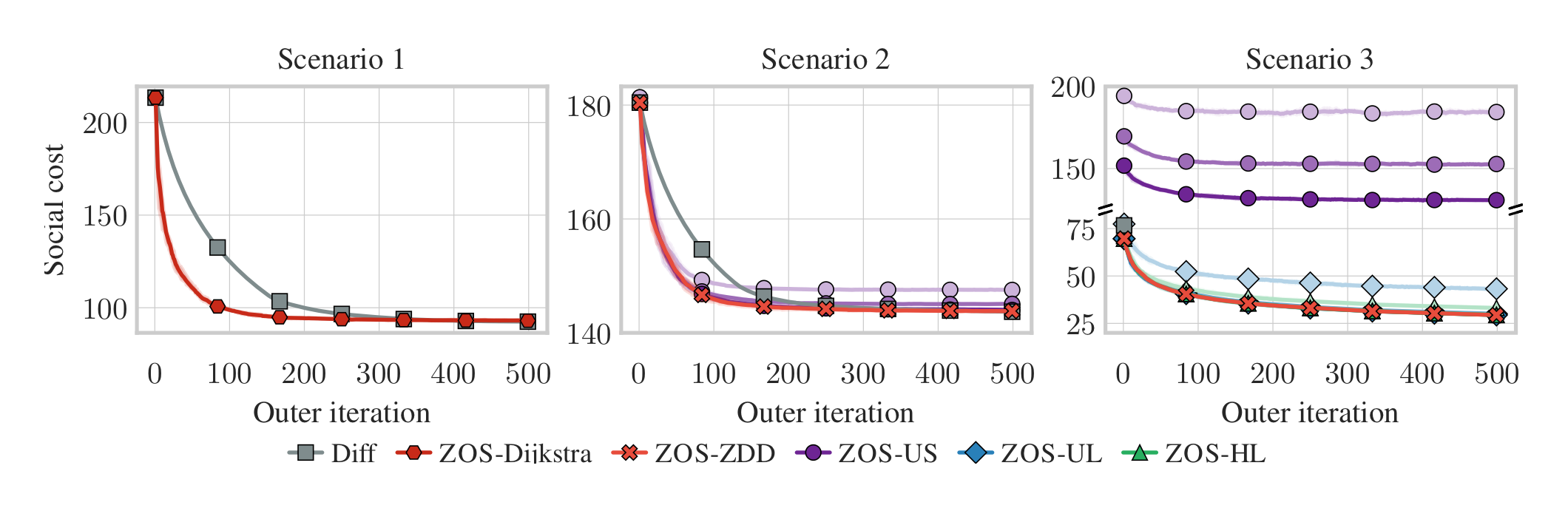 TL;DR: We study Stackelberg control in combinatorial congestion games and propose ZO-Stackelberg, a method that avoids differentiating through nonsmooth equilibria by combining a Frank-Wolfe inner solver with zeroth-order outer updates. On real transportation networks, it matches solution quality while being much faster and more memory efficient than a differentiation-based baseline.